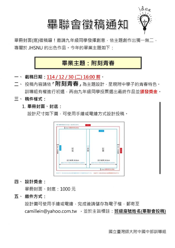 畢冊封面(底)徵稿囉!邀請九年級同學發揮創意,依主題創作出獨一無二,專屬於JHSNU的出色作品。